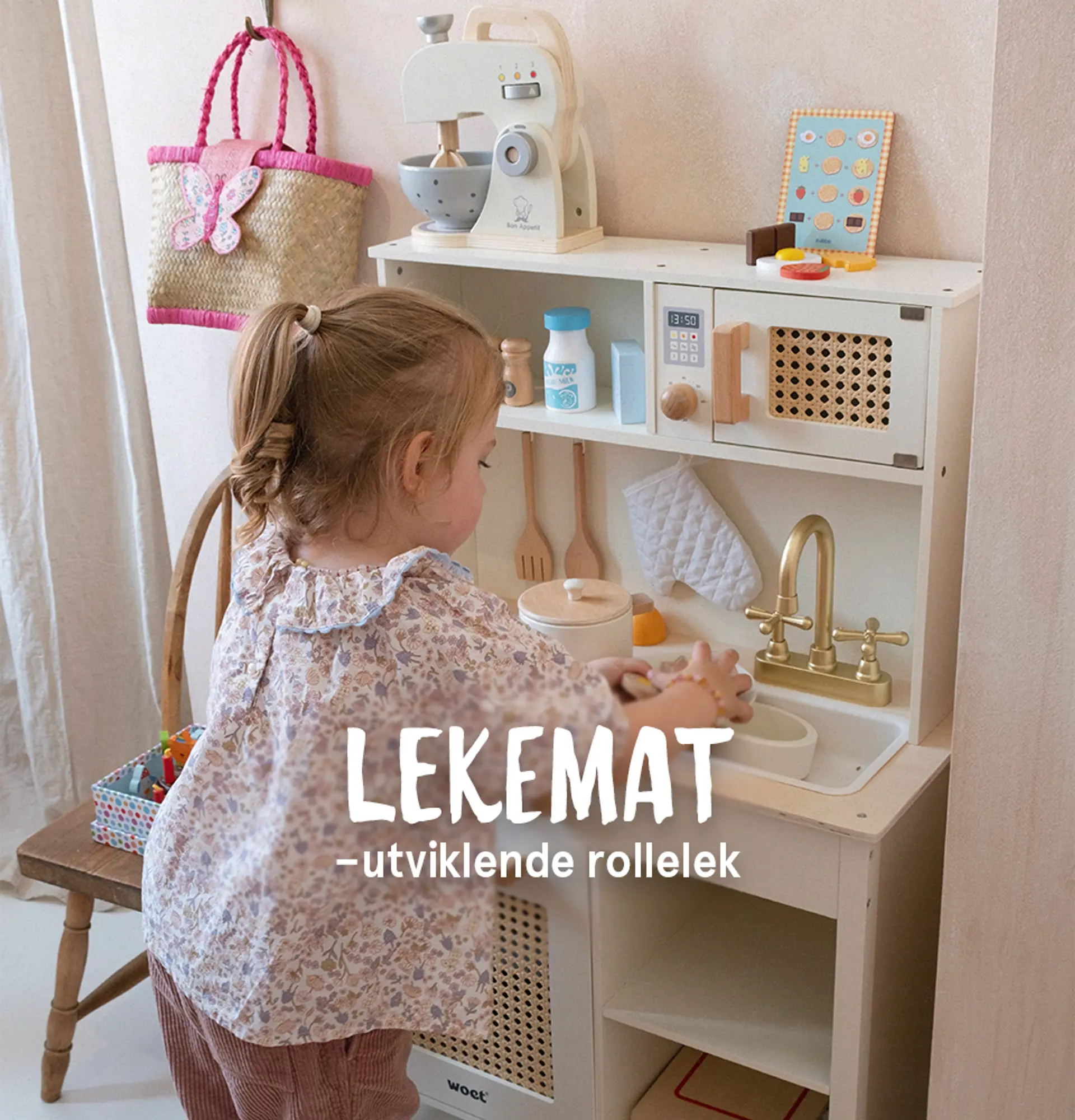 Finn frem lekekjøkkenet, lekematen, kjeler, kasseroller og annet kjøkkenutstyr og lek at dere lager mat sammen. Med smattelyder kan dere late som om dere smaker på den fantasifulle maten. Denne rolleleken er perfekt å ta med seg ut året rundt, da dere kan lage fantasimat av både snø, søle og sand.